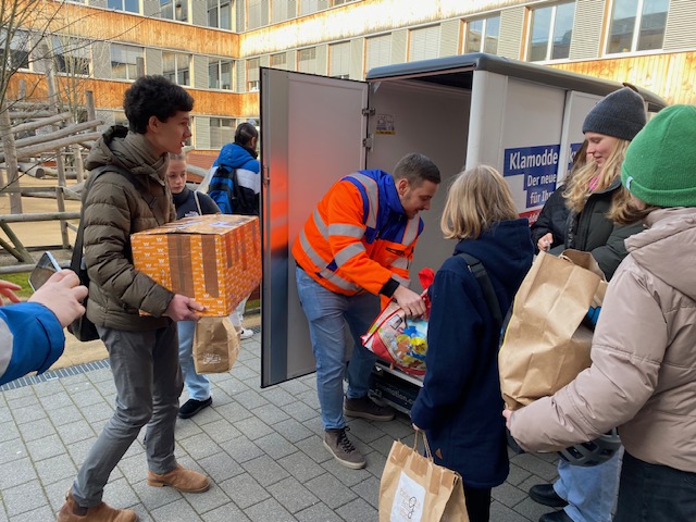 Insgesamt kamen bei der Aktion viele gut gefüllte Kleidertüten zusammen, die vom Klamoddekurier der FES, einem emissionsfreien Abholservice für Textilien, transportiert wurden. Das Fahrrad hat für viel Aufsehen auf dem Schulhof gesorgt!