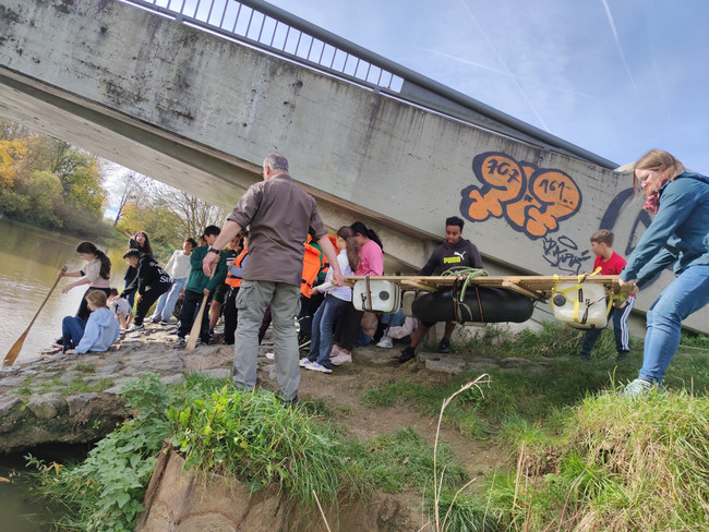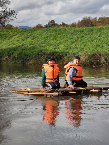 Das Highlight war natürlich die Fahrt über die Nidda. In Schwimmwesten und teilweise mit breitem Grinsen und bestimmt auch ein wenig Herzklopfen, paddelte die erste Gruppe los und sorgte so für eine sichere Überfahrt des restlichen Teams. Denn so konnte das Floß mit der Hilfe von Seilen immer von einer Seite zur anderen gezogen werden und alle 29 Schülerinnen und Schüler und ihre beiden Lehrerinnen von einem zum anderen Ufer transportieren.