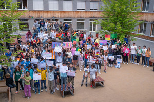 Am 06.06.2024 haben Schüler:innen des Adorno-Gymnasiums klassenübergreifend und gemeinsam mit ihrer Direktorin Annette Lommel-Sturm und ihren Lehrkräften ein wichtiges Zeichen für Demokratie und Vielfalt gesetzt. Nach dem Motto des bundesweiten Aktionstages „#IchStehAuf – Schulen für Demokratie und Vielfalt“ ist eine Schüler:innenzahl von rund 250 Personen auf unserem Schulhof rund um das Klettergerüst buchstäblich für die Demokratie und Vielfalt aufgestanden.