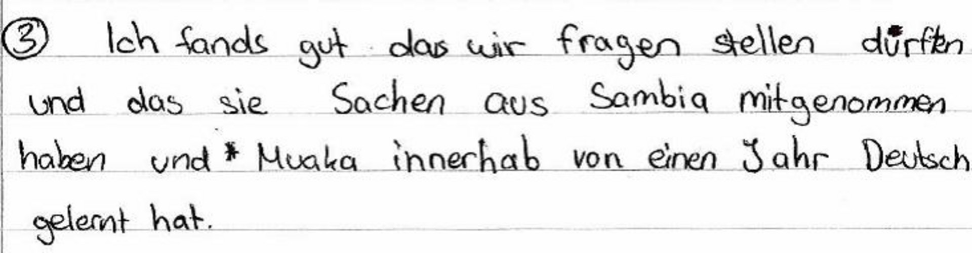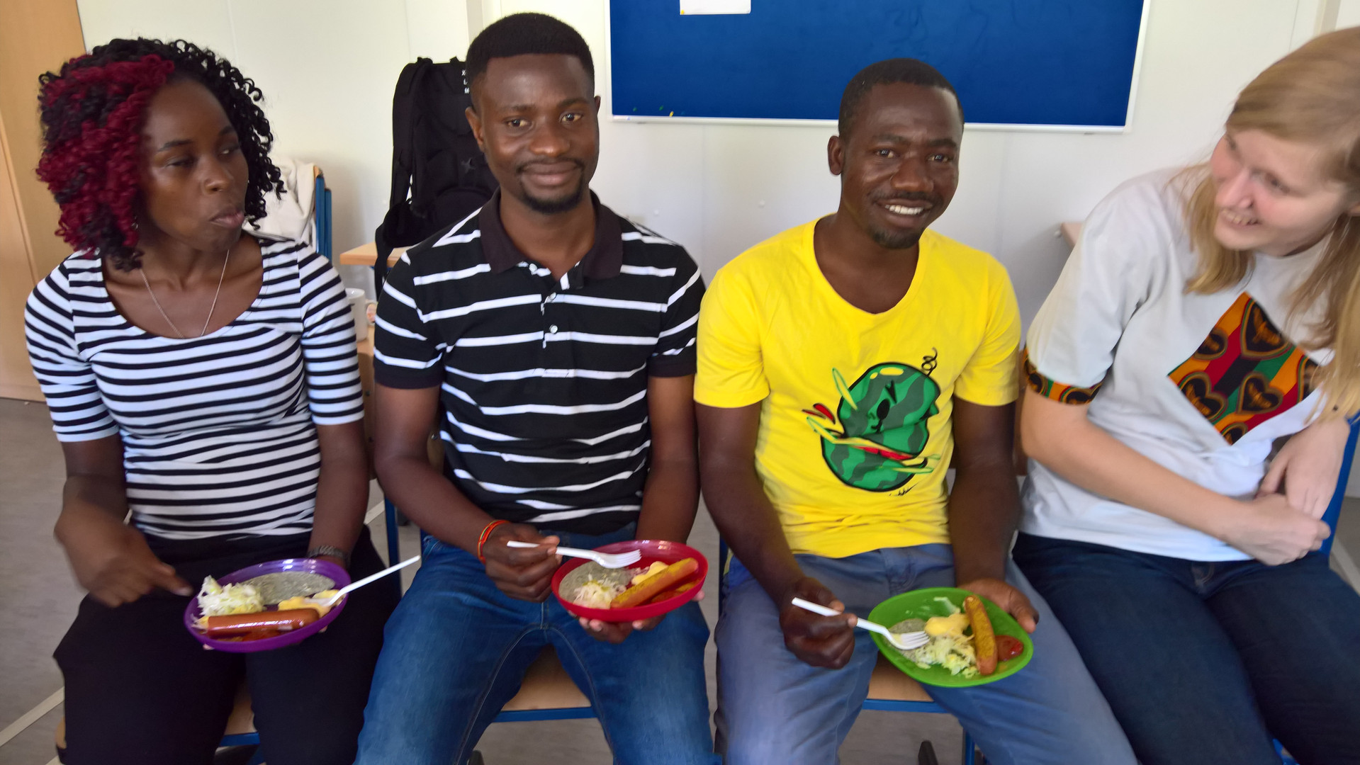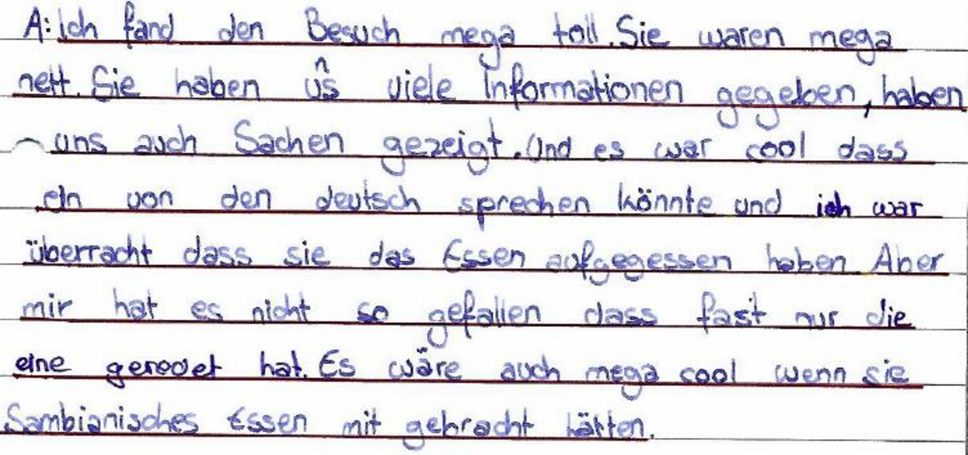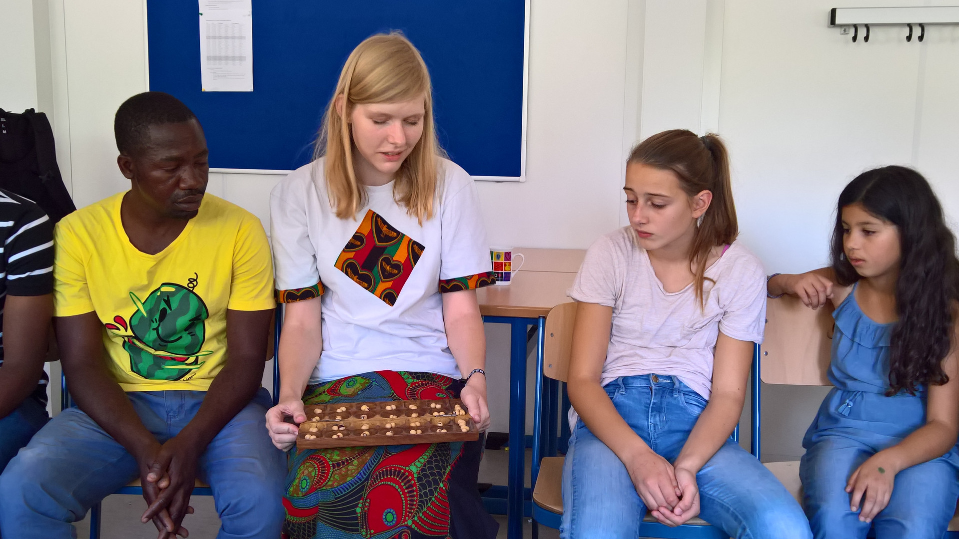 16 engagierte Sechstklässler(innen) bereiteten sich nach einer kurzen Kennenlernphase auf ihr erstes Treffen mit internationalen Gästen vor. Am 5. September, also schon in der zweiten Sitzung der AG, stellten drei Gäste aus Sambia den Schülerinnen und Schülern ihre Heimat vor! Erst tags zuvor waren zwei von ihnen – organisiert von der Fachstelle für Freiwilligendienste des Bistums Limburg – aus ihrem Heimatland in Frankfurt angekommen, und ihr erster offizieller Besuch führte sie ans Adorno-Gymnasium. Mitgebrachte Kleidung, Währung und traditionelle Spiele trugen dazu bei, dass die Schüler(innen) nicht nur etwas über Sambia und die Lebensumstände der Menschen lernen konnten, sondern die Neuankömmlinge ihrerseits mit Typischem aus Frankfurt vertraut machen durften, z.B. anhand der mitgebrachten Speisen wie der Frankfurter Grünen Soße oder mit den in der Woche zuvor angefertigten Informationsplakaten über Deutschland und Frankfurt. Präsentations- und Gesprächsphasen, in denen die Gäste bereitwillig auf die zahlreichen Fragen der Schüler(innen) eingingen, wechselten sich ab und ließen eine intensive Arbeitsatmosphäre entstehen, in der auch unterhaltsame Momente nicht zu kurz kamen. Insgesamt ein gelungener Auftakt für die AG! Viel Zeit zum Luftholen in Sachen „Eine Welt“ bleibt der AG nicht – denn schon für den 26. September hat sich der nächste internationale Besuch angekündigt.