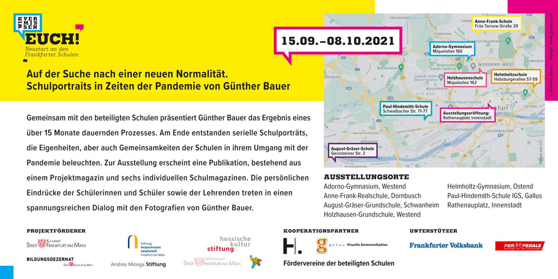 Vom 15. September bis 8. Oktober findet auf unserem Schulhof die Ausstellung „Wir vermissen euch – Neustart an den Frankfurter Schulen“ statt. Fotograf Günther Bauer zeigt hier Bilder von Schülerinnen und Schülern unserer Schule in Zeiten der Pandemie. Die Ausstellungseröffnung ist am 14.09. um 14:30 Uhr auf dem Rathenauplatz in Frankfurt. Wir laden Sie hierzu herzlich ein.