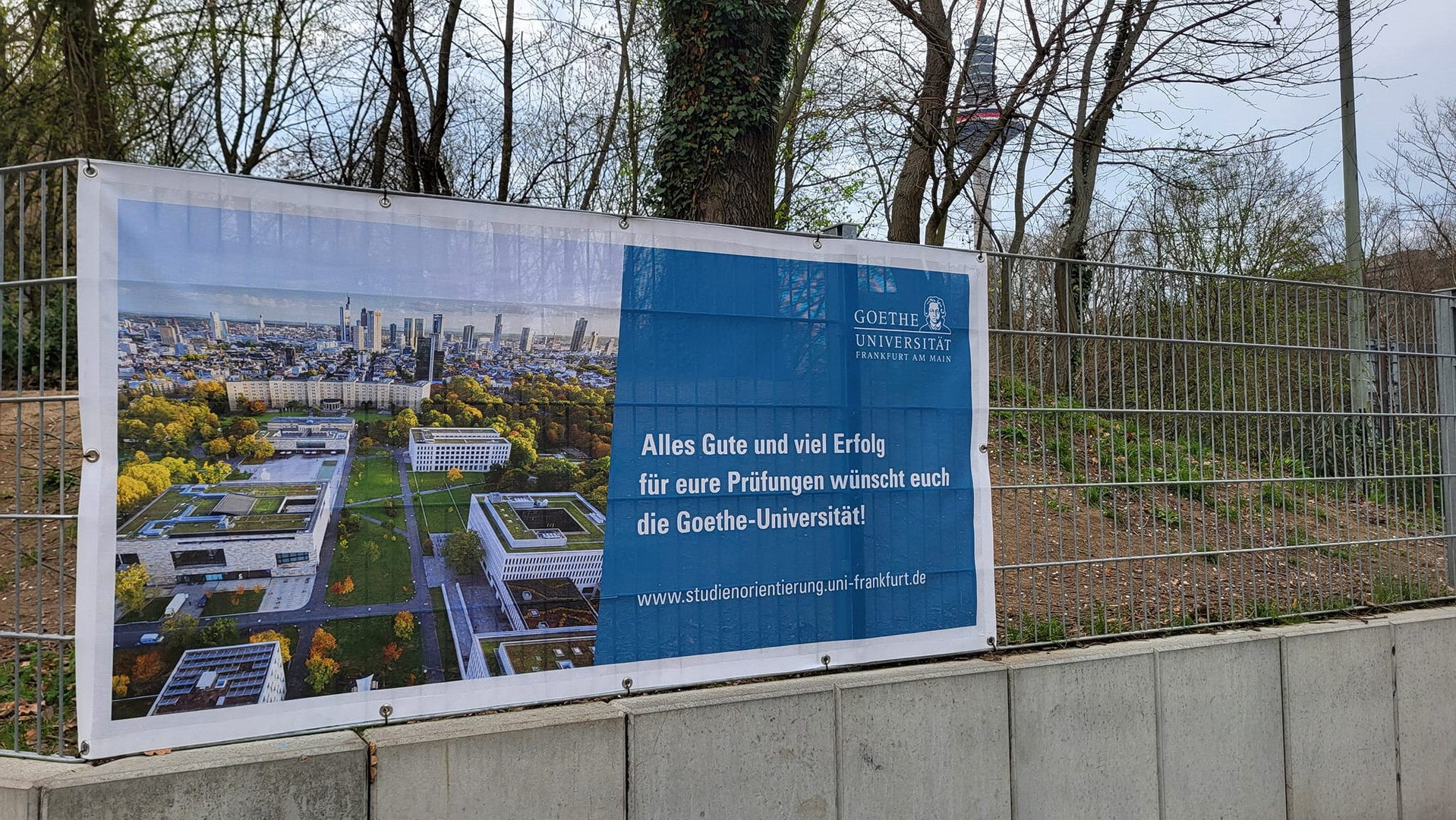 Zur mentalen Unterstützung ist es möglich, ab dem 15. April Abi-Plakate für Ihre Kinder anzubringen. Das erste Plakat von der Goethe-Uni hängt bereits. Rechts davon können Sie Ihre Plakate selbständig mit Kabelbindern befestigen. Achten Sie bitte auf eine maximale Größe von ca. 1x1m und verzichten Sie auf komplette Bettlaken. So haben alle die Chance, ein Plakat entlang des Zaunes anzubringen. Nutzen Sie dafür die gesamte Länge des Zaunes bis zum Ende des Grundstückes entlang des Gehwegs vor dem Adorno-Gymnasium. Auf Höhe des Gehweges passen auch zwei bis drei Plakate übereinander.