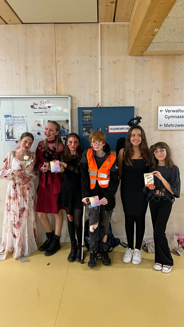 Neues Jahr, neue Halloweenparty am Adorno-Gymnasium. Wie in den vergangenen Jahren veranstaltete die Schülervertretung eine Halloweenparty, bei der die Schüler*innen in der gruselig geschmückten Aula tanzen und Spaß haben konnten. Auch der Kostümwettbewerb wurde dieses Jahr wieder abgehalten und die Gewinner mit den aufwendigsten Kostümen konnten sich über Preise freuen. Für Snacks, Getränke und Kuchen sorgte die SV, die vor der Aula ihren Stand aufgebaut hatte.