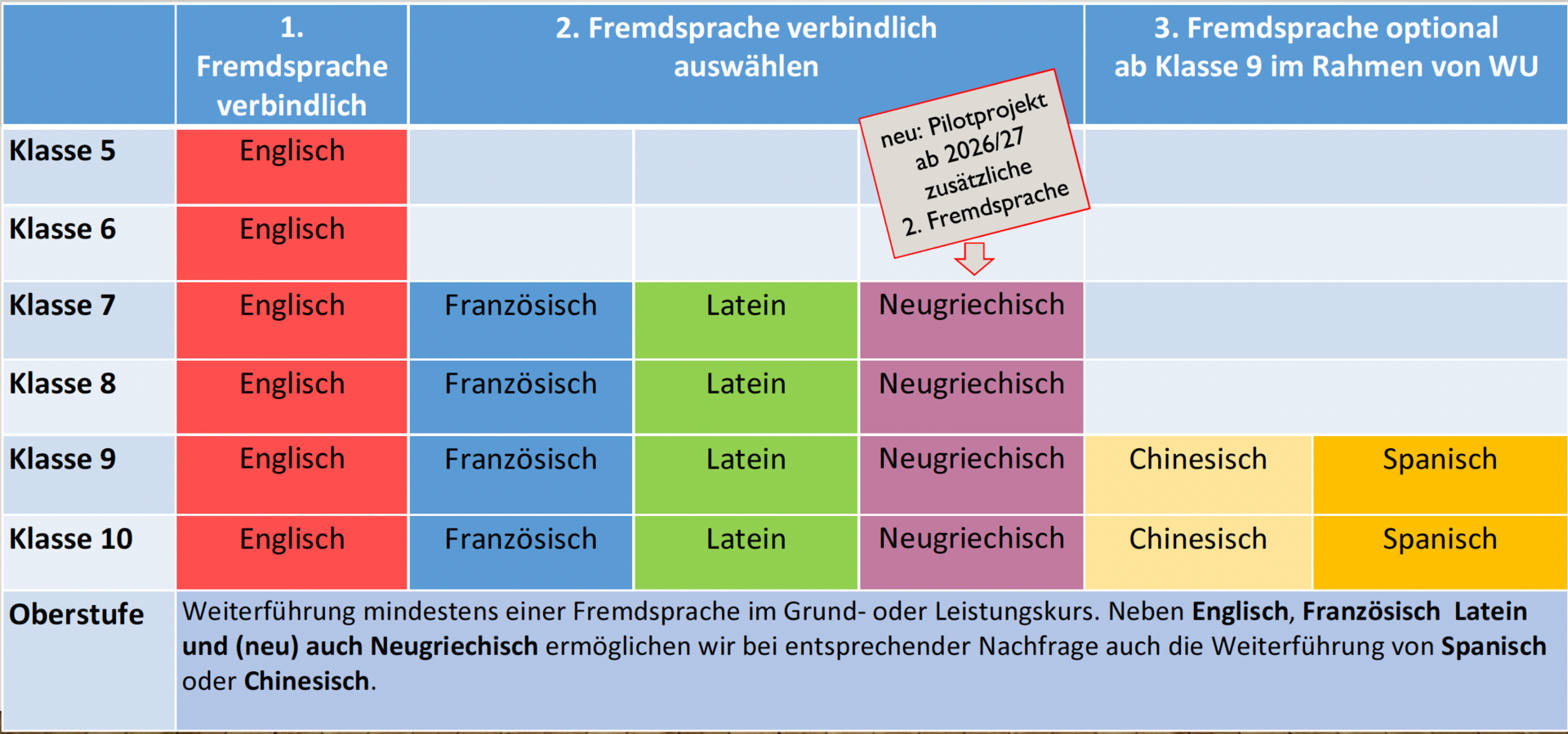 Eine dritte Fremdsprache, Spanisch oder Chinesisch, kann im Rahmen des Wahlunterrichts ab Klasse 9 gewählt werden. Beide Sprachen haben in den vergangenen Jahrzehnten an Bedeutung gewonnen, weil ihre Kenntnis ermöglicht, sich auf dem internationalen Arbeitsmarkt zu profilieren.