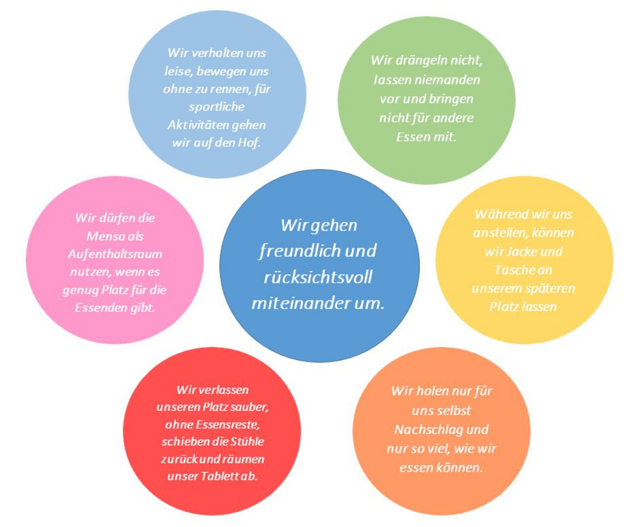 Eine halbe Stunde vor Unterrichtsbeginn am Morgen öffnet die Mensa und bietet z.B. belegte Brötchen und Getränke an. In den beiden großen Pausen findet der Verkauf von weiteren Snacks und Getränken statt. In der Mittagspause gibt es eine Auswahl verschiedener warmer Gerichte und Salate.