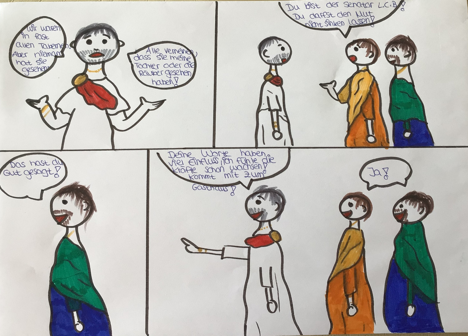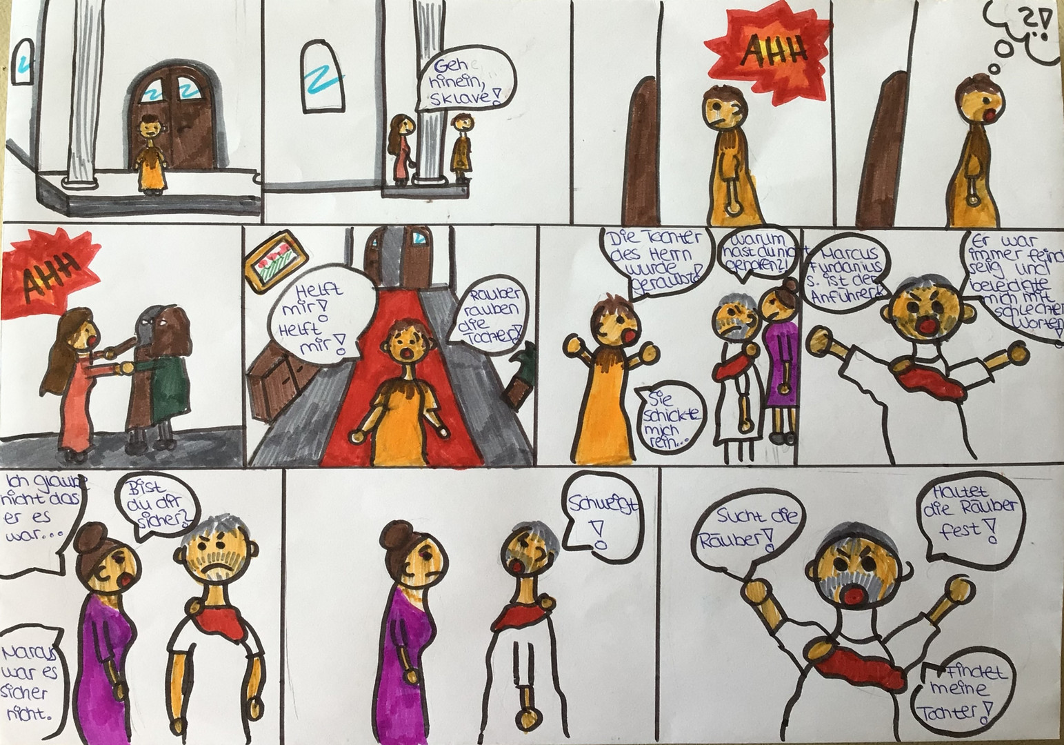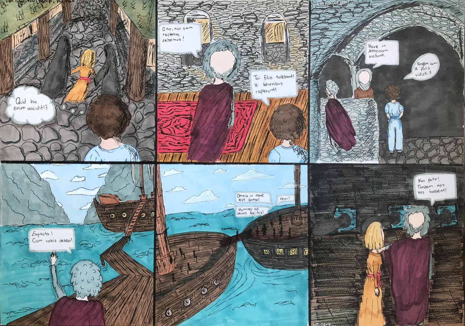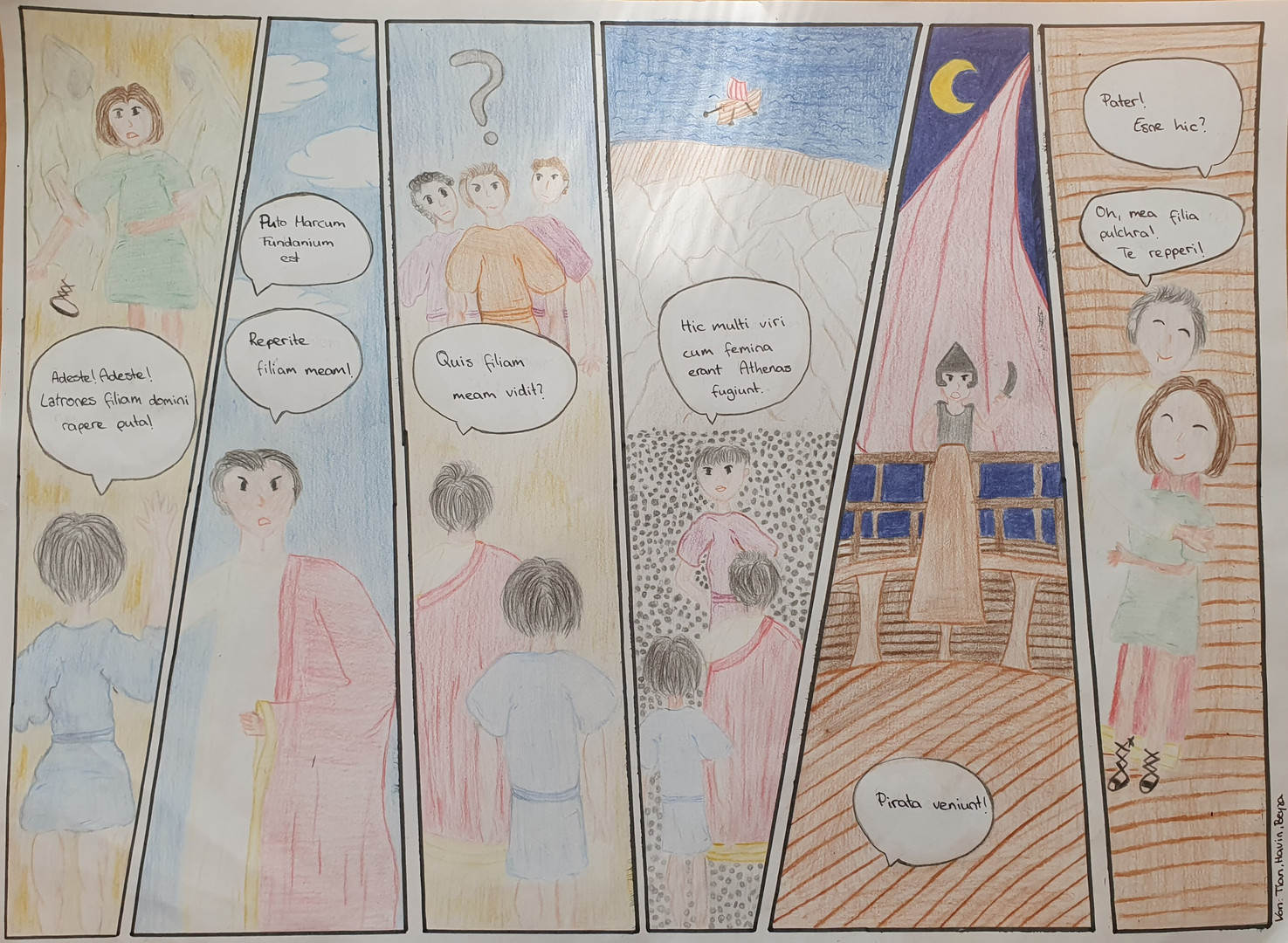 Im Rahmen der Unterrichtsreihe „Abenteuerliche Reisen“ hat die Klasse 8b während der Erarbeitung eines lateinischen Romans viel über das Reisen in der Antike erfahren. Zudem hat sie eine mitreisende Geschichte über die Entführung der Tochter des Senators kennengelernt. Mit dieser emotionalen Geschichte hat sich die Klasse gestalterisch auseinandergesetzt, was dem tristen Homeschooling-Alltag etwas Schwung verleihen konnte und den Schülerinnen und Schülern viel Spaß bereitete. Hier einige tolle Ergebnisse: