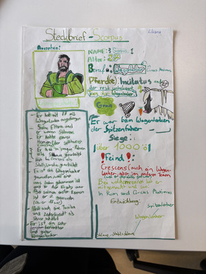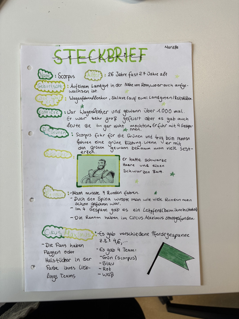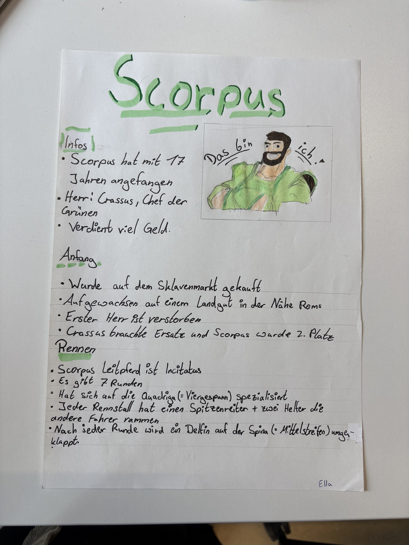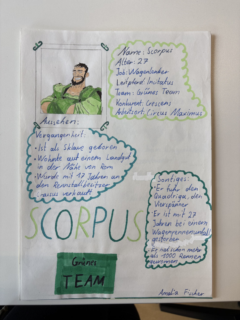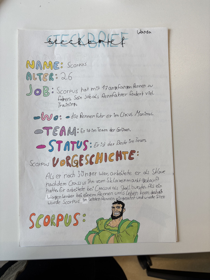 Steckbrief von Scorpus Fachbereich IDeutschEnglischFranzösischLateinExkursionenProjekteSteckbrief von ScorpusComics im Lateinunterricht der Klasse 9bHerstellen antiker WachstafelnAusflug der Klasse 8b in das Pompejanum (Aschaffenburg)Fotostory zum Mythos Narziss und EchoHerstellen antiker Wachstafeln in der 8bLapbooks im Lateinunterricht der Klasse 8Comics im Lateinunterricht der Klasse 8Comics im Lateinunterricht der Klasse 7Verkauf von römischem EssenLatein als 2. FremdspracheSpanischChinesischKunstMusik Wer war der berühmte Wagenlenker Scorpus? Die Schülerinnen und Schüler der 7a haben im Rahmen des Lateinunterrichts Steckbriefe kreativ gestaltet.