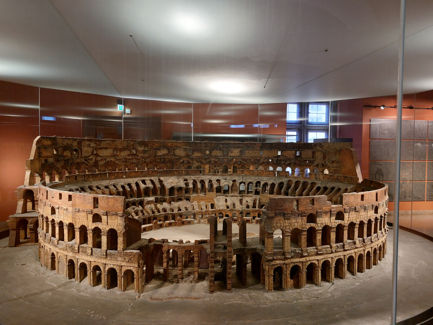 Nachdem wir die Abgründe des römischen Sittenlebens kennengelernt haben, sind wir zum Aschaffenburger Schloss gelaufen. In einem kurzen Vortrag haben wir erfahren, dass Carl May und sein Sohn ab der Mitte des 18. bis zum Beginn des 19. Jahrhunderts Korkmodelle römischer Ruinen erbaut haben, um die römische Kultur den Menschen in ihrer Umgebung näher zu bringen. In der Ausstellung „Rom über die Alpen tragen“ sind 54 Modelle zu sehen, die auf beeindruckende Weise detailgetreue Nachbildungen der berühmtesten Bauten des antiken Rom zeigen. Das Material des Korks eignete sich besonders, da es den Modellen eine sehr realistische Optik verleiht.