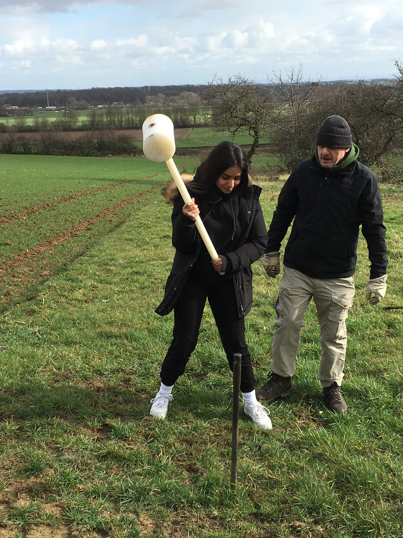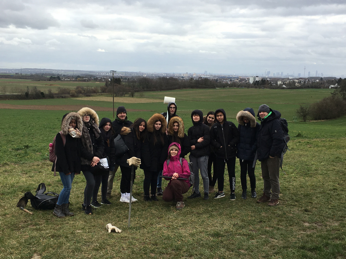 Der WU-Kurs „Gesund und nachhaltig leben“ nimmt im zweiten Halbjahr des Schuljahres 2019/2020 einen Blick auf den Boden als ein schützenswertes Gut. Zur Einführung bot den Schüler/innen Dr. Dambeck von der Goethe Universität eine Kurzexkursion an, um sich der Thematik selbstentdeckend nähern zu können. Dazu traf sich die Gruppe mit ihm in Seulberg. Vor Ort wurde an drei Stationen ein Blick auf die Kulturlandschaft und den darunter liegenden Boden genommen. Somit konnte nicht nur die Veränderung der Landschaft durch den Menschen bemerkt, sondern auch die Veränderung des Bodens nachvollzogen werden. Dabei halfen die Schülerinnen und Schüler tatkräftig, indem sie Bodenprofile erbohrten, diese beschrieben und deuteten. Mit Salzsäure konnte zudem der in der Region vorkommende Gesteinsstaub Löss nachgewiesen werden. Doch die Experimente endeten nicht in Seulberg, da die auf der Exkursion gesammelten Bodenproben nun im WU-Unterricht vertiefend unter die Lupe genommen werden.