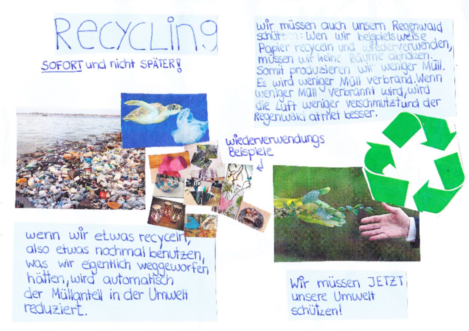 Neben Ideen zur Wiederverwertung von Papier wurde auch erkannt, dass Materialien wie Dosen und Gläser wiederverwertet werden können. Während einige SchülerInnen fleißig gebastelt haben, haben andere Plakate entworfen um auf die Situation rund um den Regenwald aufmerksam zu machen!