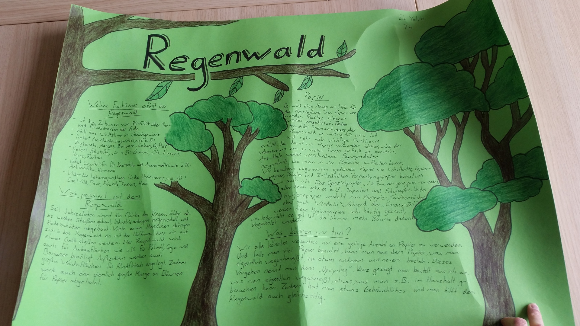 Im Rahmen des Home Schoolings im Fach Erdkunde hat sich die 7b näher mit dem Regenwald auseinandergesetzt, dabei kamen die Ziele für Nachhaltigkeit (SDGs der UN) nicht zu kurz! Denn die Schülerinnen und Schüler gingen dabei nicht nur Fragen nach wie: Wo befindet er sich? Weshalb gibt es Regenwaldregionen? Wie sind die klimatischen Verhältnisse im Regenwald? Wie sieht das Leben vor Ort aus? Welche Rohstoffe liefert der Regenwald?