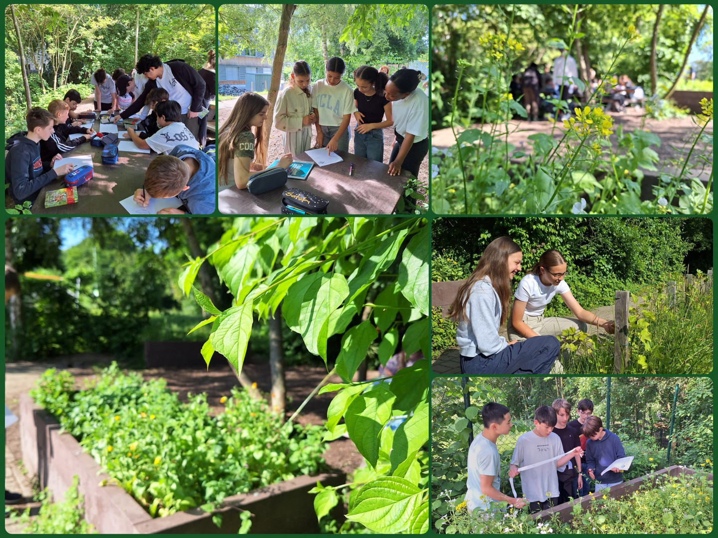 Gleichzeitig stellt diese Ecke auch unser grünes Klassenzimmer dar und bietet spannende Lernanlässe direkt vor der Tür. Die Schülerinnen und Schüler können je nach Jahreszeit immer wieder neues im Schulgarten entdecken und erforschen. In der 7. Klasse wird der Schulgarten im Rahmen des Biologieunterrichts besucht, um die dortigen Blütenpflanzen zu untersuchen. Der Schulgarten kann aber auch in anderen Fächern als Lernort genutzt werden – z.B. haben schon mehrere Klassen der Jahrgangsstufe 6 im Rahmen des Mathematikunterrichts eine Rallye im Schulgarten absolviert.
