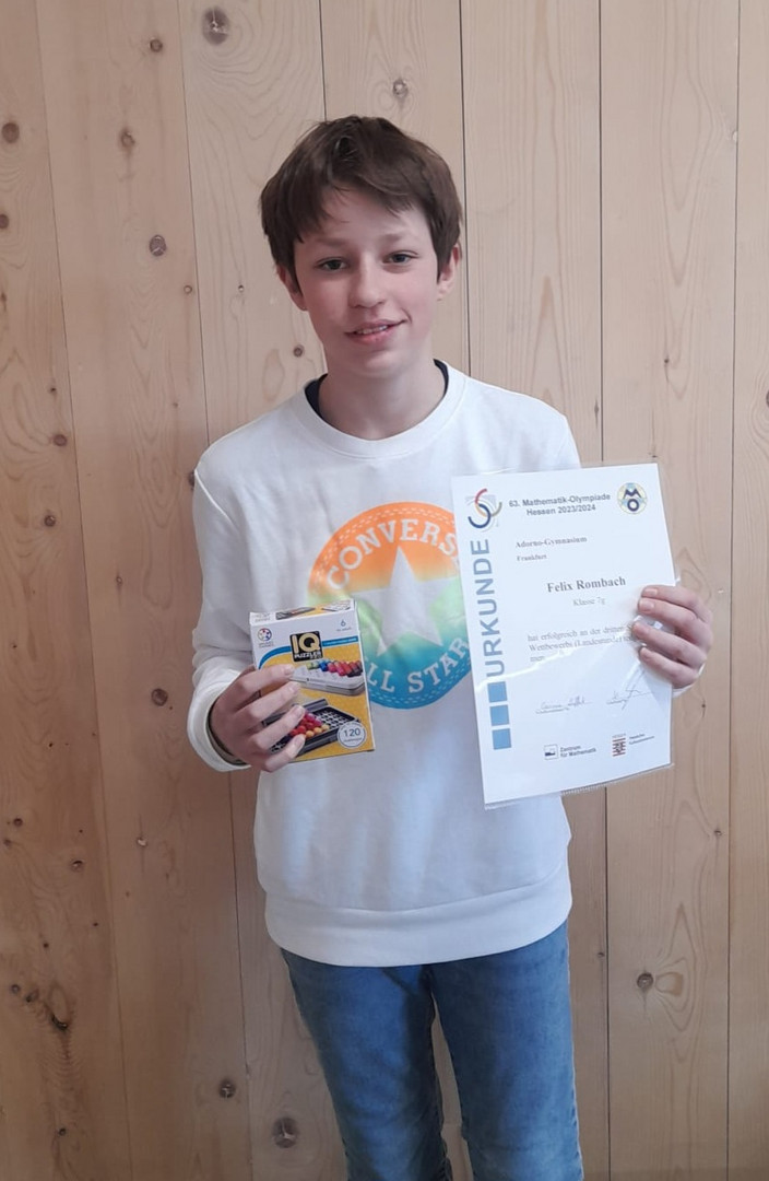 Nach der Auswertung dieser Wettbewerbsrunde war die Freude darüber groß, dass Felix Rombach (7g) das Adorno-Gymnasium in der dritten Stufe, der Landesrunde, am 24. Februar 2024 vertreten durfte. Diese fand in diesem Jahr an der Justus-Liebig-Universität in Gießen statt. Wenn es nun auch nicht mehr für das Weiterkommen in die letzte Runde, die Bundesrunde, genügte, ist seine Leistung herausragend und wir sind stolz auf ihn.