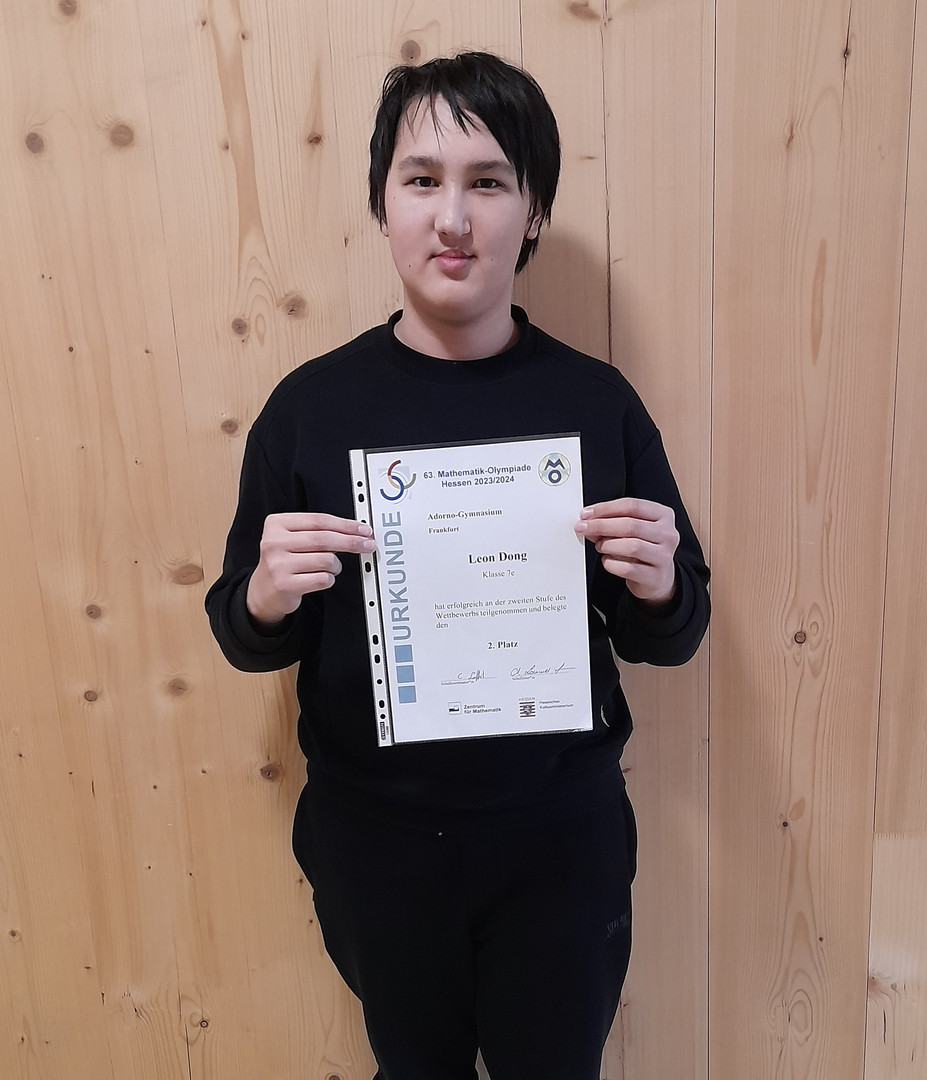 Auch in diesem Schuljahr nahmen einige Schüler:innen des Adorno-Gymnasiums an der Mathematik-Olympiade teil. Dieser Wettbewerb verläuft in mehreren Runden. In der ersten Stufe beschäftigten sich alle am Wettbewerb interessierten Schüler:innen mit den Wettbewerbsaufgaben zuhause. Die 5 Schüler:innen, die sich für die zweite Runde qualifizierten, stellten sich am 15. November in einer vierstündigen Klausur noch herausfordernden Mathematikaufgaben.